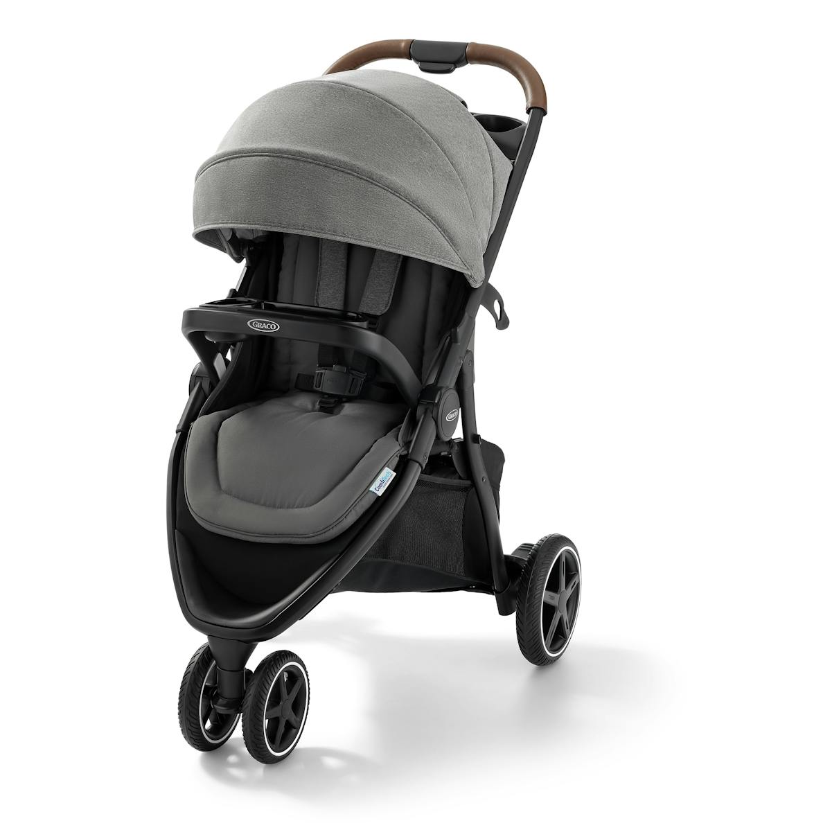 The Graco Outpace LX All-Terrain Stroller can easily maneuver wherever you want to go. The 3-wheel design and never-flat, rubber tires are a winning combination for all-terrain agility that is ready to go when you are. ComfiTech in-seat suspension provides a smoother, more comfortable ride for your little one. Getting your child in and out will be easier than ever with the SecureConnect magnetic buckle at the 5-point harness. Plus, you can adjust the height of the harness straps without rethreading, for a comfortable fit in seconds. This stroller accepts any Graco infant car seat to create your own travel system. When you're ready to pack it up, the stroller features a one-hand, self-standing fold with a folding belly bar for a more compact fold. The leatherette stroller handle is stylish and provides a smooth grip as you steer. A full-sized canopy will keep baby amply shaded, while the removable, dishwasher-safe snack tray can keep drinks and snacks within reach.