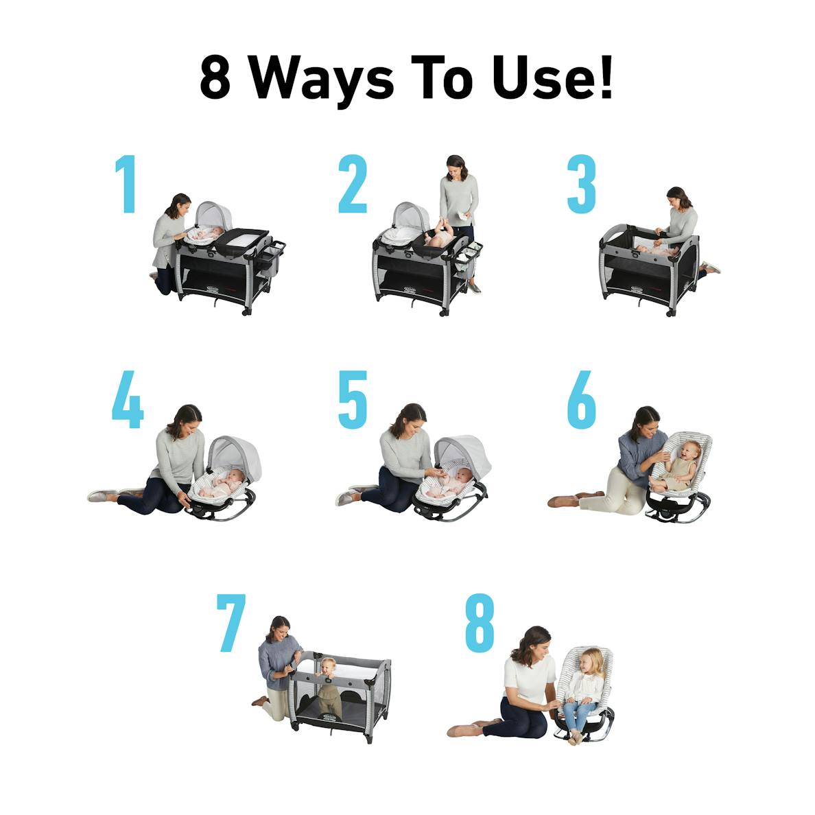 The Graco Pack 'n Play Rock 'n Grow Playard features 8 different ways to use to grow with your child! From a portable seat for newborns to a toddler seat for big kids, this playard has all you need to keep your child safe and comfortable. The Rock 'n Grow playard is an all-in-one solution, also including a wipe-clean diaper changer, storage for baby's essentials, wheels for easy portability, and Graco's signature push-button fold. The Graco Pack 'n Play Rock 'n Grow Playard is designed to transition with your child, offering an portable seat, rocker, and toddler chair for use from newborn to toddler.
